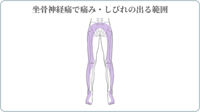 坐骨神経痛とは、お尻から太もも、ふくらはぎ、足先にかけて出る痛みやしびれの総称です。